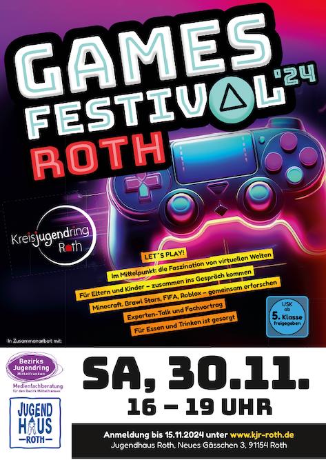 Am Samstag, den 08.11.2025 dreht sich im Jugendhaus Roth alles ums Zocken! Der KJR Roth veranstaltet gemeinsam mit dem Jugendhaus Roth und der Medienfachberatung Mittelfranken GamesFestival.