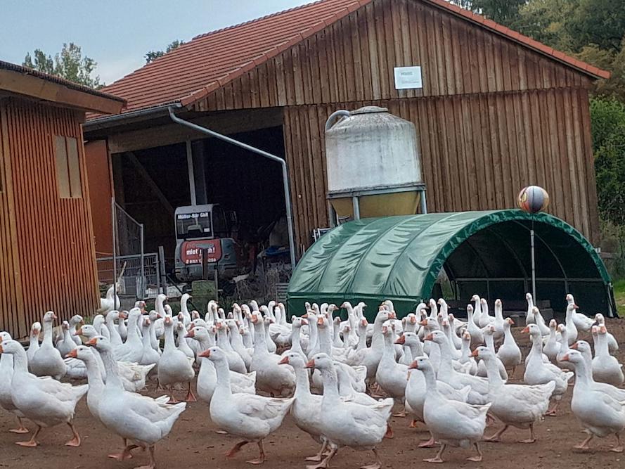 Zu dessen Geschichte berichtete Markus Bär, dass der bis dato Milchviehbetrieb vor rund 25 Jahren Platz für den neuen Betriebszweig Legehennen machte. Nach dem Motto „Gans/ganz oder gar nicht“ entschied er sich dann etwa 2010, sich mit der Mast von Puten, Gänsen und Hähnchen ganz dem Federvieh zu verschreiben. Im Hofladen und den SB-Automaten vermarktet die Familie seither den größten Teil des Fleisches, der Eier und der Nudeln selbst.