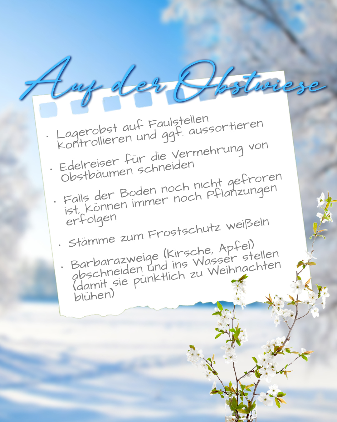 Im Dezember ist es wichtig, empfindliche Pflanzen mit Vlies oder Mulch vor Frost zu schützen. Nutzen Sie die Zeit, um Ihre Gartengeräte zu kontrollieren und gründlich zu reinigen, damit sie für die nächste Saison einsatzbereit sind.