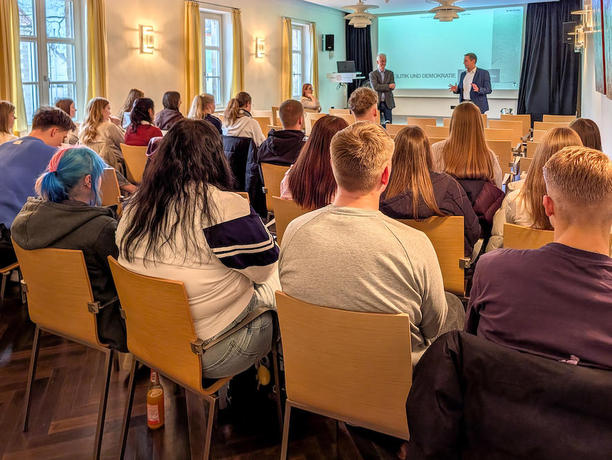 Nach einem theoretischen Einstieg zum Thema Demokratie und den Wegen politischer Entscheidungsprozesse wurde es praxisnah: Bürgermeister Markus Mahl und Landrat Ben Schwarz standen den Teilnehmerinnen und Teilnehmern Rede und Antwort. Sie berichteten aus ihrem Arbeitsalltag und schnell zeigte sich, wie vielfältig und anspruchsvoll die Aufgaben auf kommunaler Ebene sind.