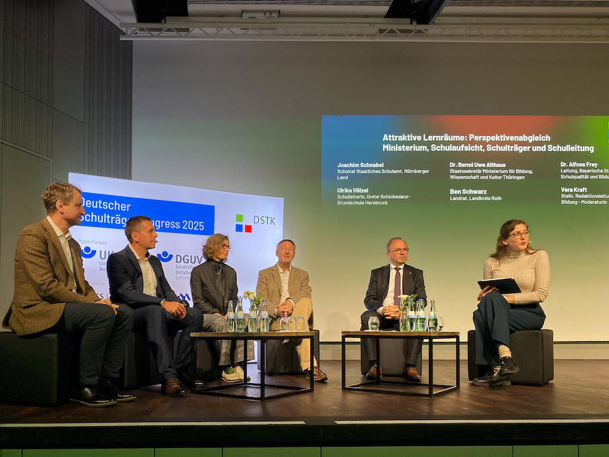 Mit „Lernräume der Zukunft" war die Gesprächsrunde überschrieben, in der Ben Schwarz als Sachaufwandsträger gefragt war. Die Schulleiter vertrat Ulrike Hölzel aus Hersbruck, Dr. Alfons Frey, Leiter des Staatsinstituts für Schulqualität und Bildungsforschung, brachte diesen Bereich ein. Für die Schulaufsicht war Joachim Schnabel aus dem Landkreis Nürnberger Land gekommen. Der nahm eine Doppelrolle ein, hat er doch in Schnaittach ein „Muster-Klassenzimmer“ konzipiert, das Lehren und Lernen in der Gruppe und individuell mit verschiedenen Methoden möglich macht, das gleichermaßen Rückzugsbereiche und Kreativzonen bietet. Und, ganz entscheidend, auch im Bestand realisiert werden kann.