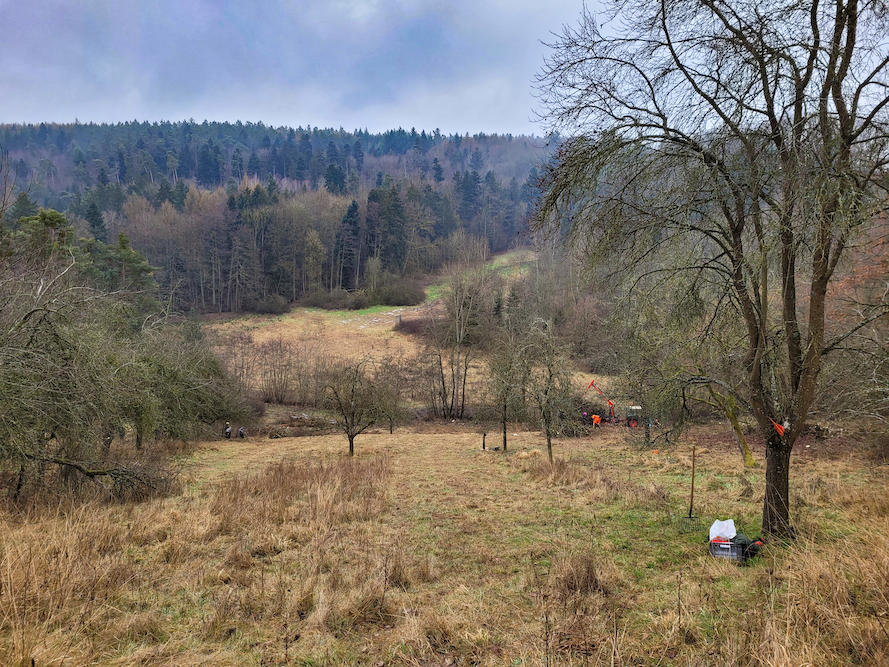 Morgens, halb neun, auf einer Hangfläche in Großweingarten. Knapp über Null Grad, der Nebel hängt tief. Nichts trübt die Stille – bis eine Motorsäge erklingt. Und für knapp 15 Studierende ein besonderer Unterrichtstag beginnt.
