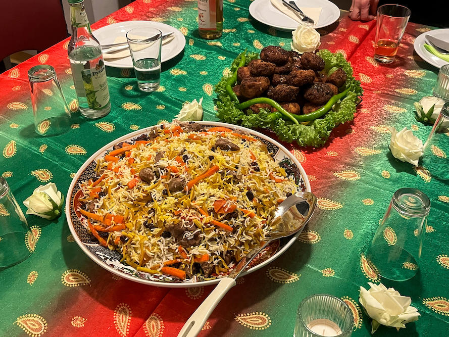 Damit zur „Gastgeberin“ und Köchin an jenem Abend: Quandi Gol, die von ihrem Sohn Ahmad unterstützt wurde. Qandi Gol kommt zum Deutschlernen ins Haus international und würde zumindest vormittags gerne arbeiten. Ihr Sohn besucht die Mittelschule und spielt leidenschaftlich gerne Fußball. Vor gut drei Jahren ist die Familie nach Deutschland gekommen, die Gedanken sind aber tagtäglich in der Heimat, in der der Großteil der Verwandten Familie lebt – unter schwierigen Bedingungen.