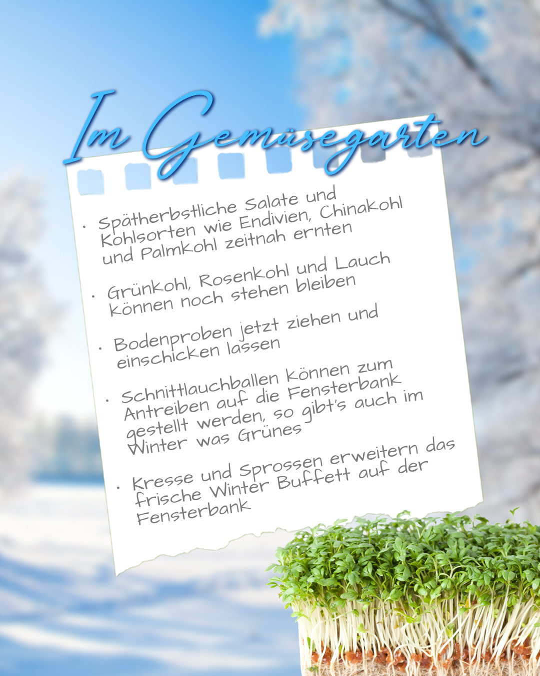 Der Winter ist auch eine gute Gelegenheit, Ihren Garten für das kommende Jahr zu planen und neue Ideen zu sammeln. Vergessen Sie nicht, die Vögel zu füttern, damit sie gut durch die kalte Jahreszeit kommen. So können Sie auch im Dezember Freude an Ihrem Garten haben.