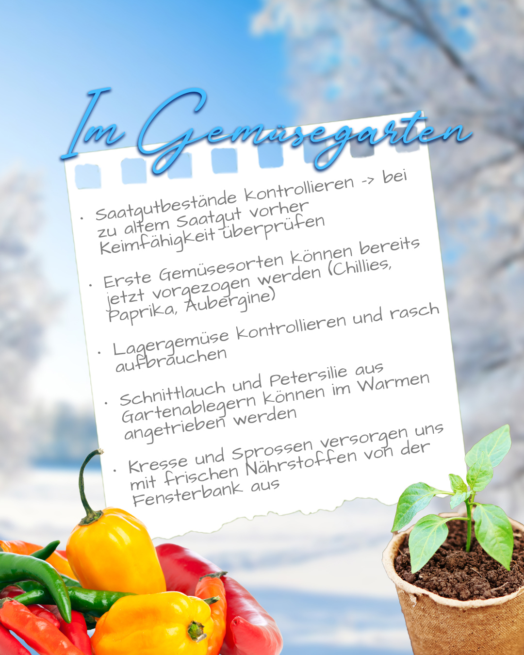 Der Februar ist ideal, um drinnen mit Paprika, Chillies und Auberginen zu starten und draußen bei Temperaturen über 0 Grad Celsius Schnittmaßnahmen an Obstbäumen durchzuführen.