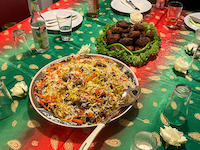 Damit zur „Gastgeberin“ und Köchin an jenem Abend: Quandi Gol, die von ihrem Sohn Ahmad unterstützt wurde. Qandi Gol kommt zum Deutschlernen ins Haus international und würde zumindest vormittags gerne arbeiten. Ihr Sohn besucht die Mittelschule und spielt leidenschaftlich gerne Fußball. Vor gut drei Jahren ist die Familie nach Deutschland gekommen, die Gedanken sind aber tagtäglich in der Heimat, in der der Großteil der Verwandten Familie lebt – unter schwierigen Bedingungen.
