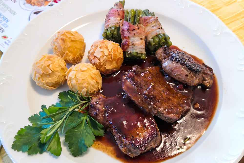 Besser war auch kaum vorstellbar ob dessen, was Wirtin Stefanie Möller den Gästen kredenzte: Ihrem Gruß aus der Küche (geröstetes Weißbrot mit Wildschinken) folgten eine Leberknödelsuppe mit Rehleber und Wurzelgemüse, Rückensteaks von Hirsch, Wildschwein und Reh an Preiselbeer-Rosmarin Jus (als Beilagen Mandelkroketten und Bohnenbündchen) sowie ein Apfel-Crumble im Glas, das mit Vanille verfeinert wurde.