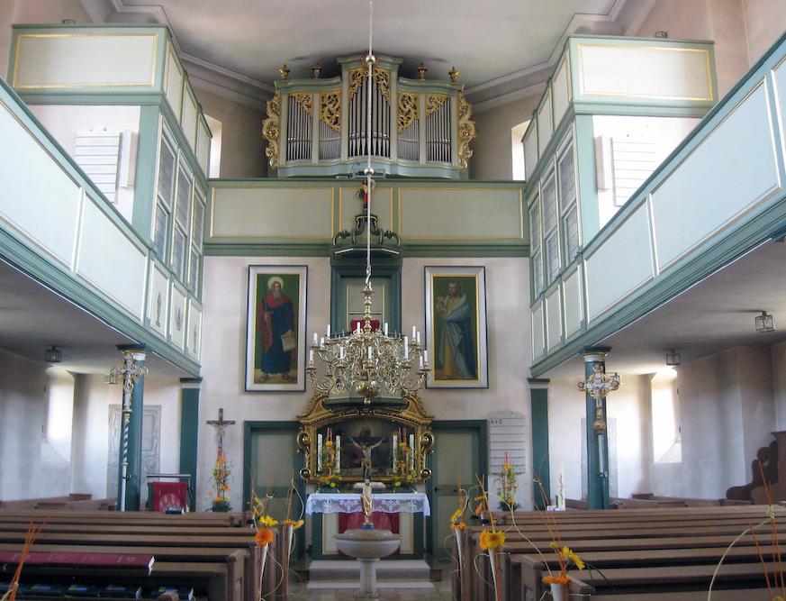 Von der Mitte des 17. bis zum Ende des 18. Jahrhunderts entwickelte sich die Gestaltung fort. Zunächst waren mit einem ausgeformten und erhöhten Altarraum sowie einer davon abgesetzten Kanzel noch deutliche Anlehnungen an traditionelle Vorbilder erkennbar. Nach und nach bildete sich die Gestaltung des Innenraums als rechteckige Saalkirche heraus, bei der auf eine Trennung oder gestufte Absetzung des Altars vom Kirchenschiff ebenso verzichtet wurde wie auf ein Querschiff. In vielen dieser Kirchen findet sich ein Kanzelaltar, eine Komposition, bei der die Kanzel an zentraler Stelle in den Altaraufbau integriert ist. Vor dem Altar ist oft der Taufstein platziert, wodurch es zu einem gestalterischen Dreiklang kommt. Dieser gibt die lutherische Theologie wieder, bei der die Predigt mit den beiden Sakramenten Taufe und Abendmahl gleichrangig ist.